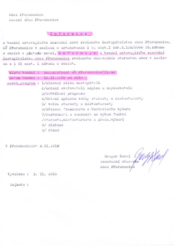 Informace o konání ustavujícího zasedání Zastupitelstva obce Přerubenice 1